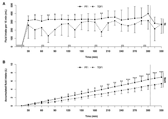 Patterns of fluid intake during the 5 h fixed-workload exercise period and the 20 km time-trial for the programmed (PFI) and thirst-driven fluid intake (TDFI) strategies. Fluid intake per 15 min interval (A) and accumulated fluid intake (B). * p < 0.05, ** p < 0.01, *** p < 0.001 for difference between conditions, # significant time effect (p < 0.001), $ significant interactions (p < 0.05). Vertical dotted line represents the onset of the time-trial. Shaded areas above the x-axis represent the moments when athletes did not have access to water. Values are means ± SD.