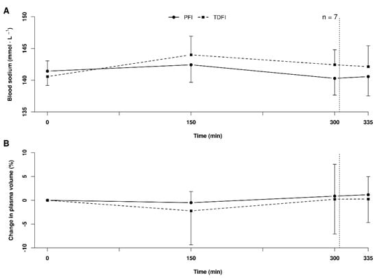 Due to a measurement error, the sodium values of one participant were excluded from the analysis. Figure 3A shows the changes in blood sodium concentration over time with PFI and TDFI. Blood sodium concentration was lower with PFI than TDFI during exercise, but the difference did not reach significance. The lowest blood sodium value measured with TDFI was 136 mmol L−1 (n = 1), compared to 137 mmol L−1 with PFI (n = 2) at the end of PFI. As demonstrated in Figure 3B, the plasma volume variations were similar between conditions (p = 0.67), with no time (p = 0.30) or interaction effects (p = 0.93).