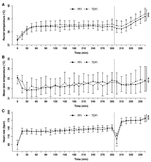 Figure 4 depicts the changes in rectal temperature (A), mean skin temperature (B) and heart rate (C) over time during exercise with PFI and TDFI. An effect of time (p < 0.0001) and interaction (p < 0.0001), with a trend for a condition effect (p = 0.054), was observed for rectal temperature. Rectal temperature reached 38.4 ± 0.3 °C and 38.6 ± 0.3 °C at the end of the 5 h fixed-workload exercise period for the PFI and TDFI conditions, respectively (p < 0.05). At the end of the TT, rectal temperature was still lower (p < 0.05) with PFI (39.2 ± 0.4 °C) than TDFI (39.4 ± 0.4 °C). Mean skin temperature was similar between the conditions (p = 0.834), but an effect of time (p < 0.0001) and interaction (p < 0.05) was observed. There was no effect of condition on heart rate (p = 0.23), but an effect of time (p < 0.0001) and interaction was observed (p < 0.05).