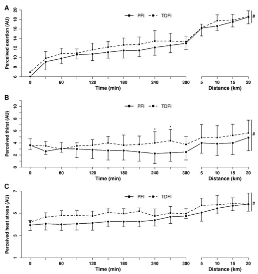 Figure 5 demonstrates the changes in perceived exertion (A), heat stress (B) and thirst (C) over time during exercise with PFI and TDFI. Perceived exertion and perceived heat stress increased similarly between conditions (both p > 0.05) over time (both p < 0.01), with no interaction effect (both p > 0.05). Perceived thirst increased over time (p < 0.0001), more with TDFI than PFI (p < 0.05), but no interaction was observed between conditions (p = 0.09).