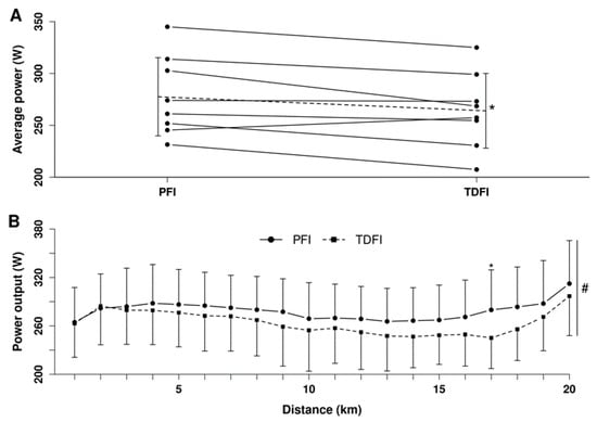 Average power outputs of each participant (A) and changes in power output (B) during the 20 km time-trial for the programmed (PFI) and thirst-driven fluid intake (TDFI) strategies. Dotted line represents the average of the 8 participants. * p < 0.05 for difference between conditions, # significant distance effect (p < 0.001). When required, values are reported as means ± SD.