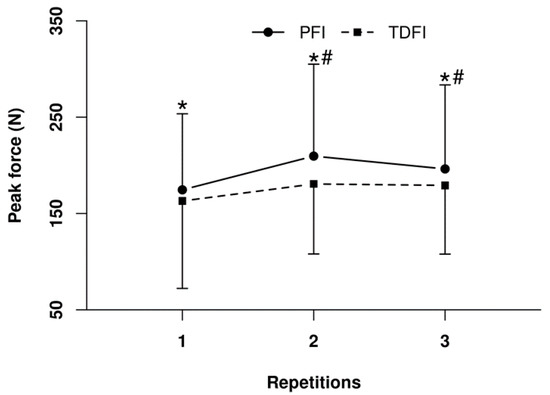 Regarding the incidence of muscle cramps, 25% of contractions of the right plantar flexors led to a true cramp, but there was no difference (p = 0.75) between conditions for the prevalence. Nevertheless, as demonstrated in Figure 7, the mean peak force produced against the force plate was greater (p < 0.01) with PFI than TDFI for all three trials. Moreover, mean peak force production increased over time with PFI (p < 0.05), which was not observed with TDFI.