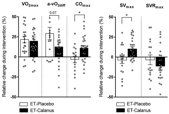 Individual relative changes in cardiorespiratory parameters during the intervention in ET-Placebo (n = 16–24) and ET-Calanus groups (n = 24–27). Data are presented as mean ± SEM; * p < 0.05 (Mann–Whitney test). VO2max: maximal oxygen consumption; a-vO2diff: peripheral extraction of oxygen; COmax: maximal cardiac output; SVmax: maximal stroke volume; SVRmax: maximal systemic vascular resistance.