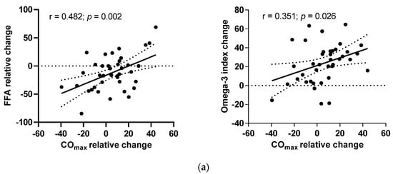 When looking to the predictors of changes in COmax, in response to the intervention, we performed correlations and a multiple regression analysis. The multiple regression showed that SVR and circulating FFA levels significantly predicted a change in COmax (β = −0.41, p = < 0.001 and β = 0.26, p = < 0.001, respectively) whereas age and body composition were not significantly associated with a COmax change (data not shown). The relative changes in COmax correlated positively with changes in the omega-3 index (Figure 2a). Although the changes in COmax were not correlated with the changes in leptin concentration, the plasma levels of leptin correlated with COmax before and at the end of the interventions (Figure 2b).