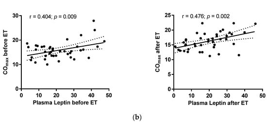 Correlations of (a) relative changes in maximal cardiac output (COmax) with relative changes in free fatty acids (FFA) in ET-Placebo and ET-Calanus groups during the intervention; (b) COmax with plasma leptin levels before and after the intervention in all subjects. The Pearson’s correlation coefficient is presented (ET-Placebo, n = 16; ET-Calanus group, n = 24).