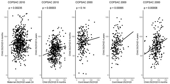 3.1. Associations of 25(OH)D from Pregnancy to Childhood and in Childhood