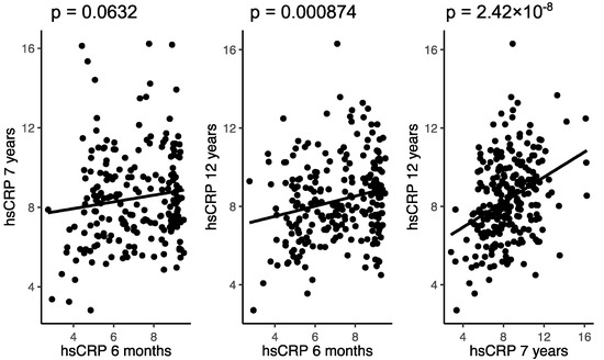 - Juonala, M.; Viikari, J.S.; Rönnemaa, T.; Taittonen, L.; Marniemi, J.; Raitakari, O.T. Childhood C-reactive protein in predicting CRP and carotid intima-media thickness in adulthood: The Cardiovascular Risk in Young Finns Study. Arterioscler. Thromb. Vasc. Biol. 2006, 26, 1883–1888. [Google Scholar] [CrossRef] [PubMed] [Green Version]