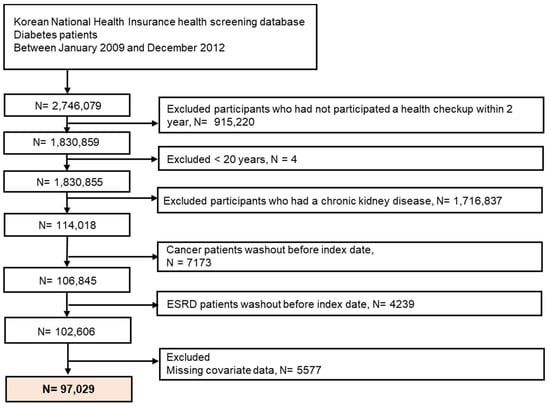 Initially, 2,746,079 patients with diabetes who underwent health check-ups from 2009 to 2012 were identified. Of these, we included patients with diabetes who underwent a repeat health check-up after 2 years. The index date was the date of the last health check-up. We excluded those aged <20 years because ESRD development is rare in this subpopulation, having malignancy or with a history of ESRD prior to the index date, and those with missing health examination data. Subsequently, 97,029 patients with DM were included in this study. Figure 1 shows a detailed flowchart of the patient selection. The participants were followed up until ESRD was newly diagnosed or censored by death, loss of health insurance qualification, or end of study (31 December 2019).