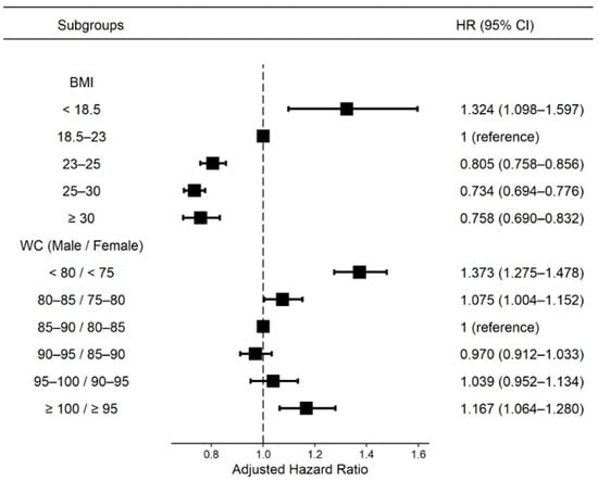 Figure 2 shows the risk of ESRD according to BMI or WC. The underweight group with BMI < 18.5 kg/m2 (HR: 1.324, 95% CI: 1.098–1.597), the WC < 85/80 cm group (HR: 1.373, 95% CI: 1.275–1.478), and the WC > 100/95 cm group (HR: 1.167, 95% CI: 1.064–1.280) showed higher ESRD risk compared with the reference group (BMI: 18.5–23, WC: 85–90/80–85), while the BMI 25–30 kg/m2 group showed the lowest ESRD risk (HR: 0.734, 95% CI: 0.694–0.776) in all participants after adjusting for age, sex, income, presence of hypertension, dyslipidemia, smoking, alcohol drinking, physical activity, glomerular filtration rate, DM duration, use of insulin and number of oral hypoglycemic agents. We also analyzed the results of censoring patients who developed cancer during follow-up to exclude weight loss due to cancer, and the effect of ESRD on weight change was similar to that before cancer censorship (Supplementary Table S1).