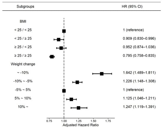 The median follow-up duration was 5.1 years, and incident ESRD was identified in 7932 (4.81%) of the participants over the observation period. The association between BMI or body weight change and the incidence and risk of ESRD in patients with DM is presented in Figure 3. According to BMI change analysis, the BMI ≥ 25/≥25 kg/m2 group showed the lowest incident ESRD risk in patients with DM (HR: 0.795, 95% CI: 0.758–0.835) compared to the reference (BMI < 25/<25 kg/m2) group. According to the body weight change analysis, patients with ≥10% weight loss over 2 years showed the highest risk for ESRD (HR: 1.642, 95% CI: 1.489–1.811) compared with the reference group (bodyweight change <5%) after adjusting for all covariates (Figure 3, Supplementary Table S2).