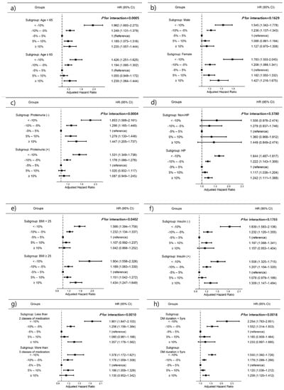 Subgroup analysis for adjusted hazard ratios (HRs) of ESRD. (a) Age subgroup, (b) sex subgroup, (c) history of proteinuria subgroup, (d) hypertension subgroup, (e) body mass index subgroup, (f) use of insulin subgroup, (g) use of more than three oral hypoglycemic agent subgroups, (h) >5 years DM duration subgroup. Horizontal lines represent the range for 95% confidence intervals (CIs). Models were adjusted for age, sex, smoking, alcohol consumption, regular exercise, income status, insulin use, more than three classes of oral hypoglycemic agents, diabetes duration, previous histories of hypertension and dyslipidemia, and previous body weight. HP, hypertension; BMI, body mass index; DM, diabetes mellitus.