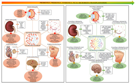 Dysbiosis of the gut microbiota is primarily characterized by decreased diversity and abundance of bacteria and fungi, especially those associated with dysfunction and various pathologies [3]. Chief among them are cardiovascular, neuronal, immune and metabolic disorders [4] through the influence of bile acid metabolism, inflammatory status, insulin resistance and incretin secretion. This can lead to the emergence of obesity [5], metabolic syndrome and the onset of type 2 diabetes [6,7] through decreased glucose tolerance and insulin resistance [8]. The gut microbiota is an important player in chronic systemic inflammation secondary to endotoxemia caused by the release of endotoxins following bacterial death [9]. While the link between the gut microbiota and the onset and progression of diabetes is still under investigation, several studies to date have focused on the pathophysiology of diabetes, with few of them investigating the role of the gut microbiota in diabetes complications. This review summarizes the most important findings regarding the role of the gut microbiota in type 2 diabetes and describes its role on potential pathways that lead to chronic complications of diabetes. Modulation of the gut microbiota through the use of prebiotics, probiotics, synbiotics and fecal microbiota transplantation to restore metabolic deficits associated with these pathologies is also discussed.