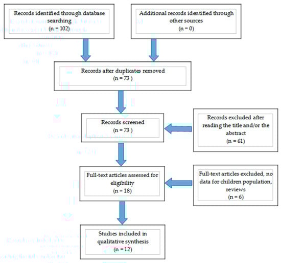 Following the terms listed above, the electronic database search resulted in 102 articles, which were then checked for duplicates. After exclusion of duplicates, our list was restricted to 73 articles. No additional records were from other sources (manual research, reference lists of other papers). A total of 73 articles were thoroughly assessed by two independent researchers based on title/abstract and the inclusion and exclusion criteria. According to the eligibility criteria, 18 full-text articles remained for further assessment. Among these full-text articles, 6 were excluded for the following reasons: wrong study type, namely reviews/systematic reviews, or information that did not meet the eligibility criteria and the purpose of this systematic review (third step). Finally, 12 full-text articles were considered eligible and were included in our qualitative synthesis. The study selection procedure is detailed in the respective flow chart (Figure 1).