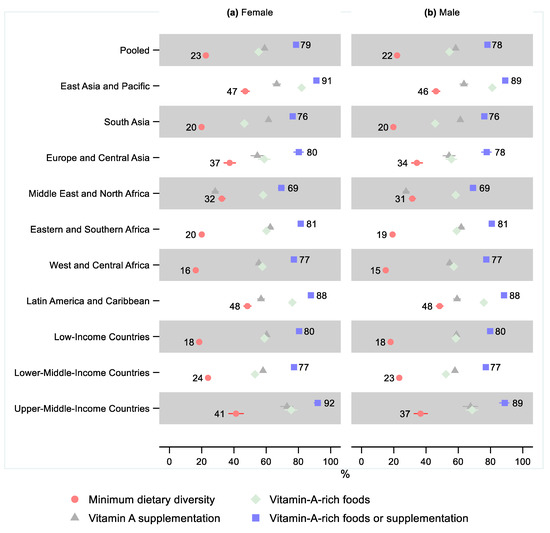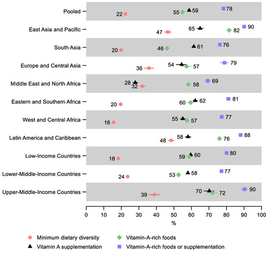 The lowest percentage of children receiving minimum dietary diversity was observed in West and Central Africa—16% (95% CI: 15, 17), Eastern and Southern Africa—20% (95% CI: 19, 21), and South Asia—20% (95% CI: 19, 20). The lowest share of children receiving either vitamin-A-rich foods or vitamin A supplementation was in the Middle East and North Africa—69% (95% CI: 68, 71) and South Asia—76% (95% CI: 76, 77). South Asia also had the lowest share receiving vitamin-A-rich foods—46% (95% CI: 45, 47), and the Middle East and North Africa, in addition to having the lowest share receiving either vitamin-A-rich food or supplementation, also had the lowest share of children receiving vitamin A supplementation—28% (95% CI: 27, 29).