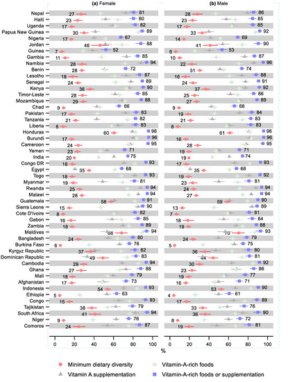 We estimated the percentage of children 6–23 months old receiving the minimum dietary diversity, vitamin-A-rich foods, vitamin A supplementation, and either vitamin-A-rich foods or vitamin A supplementation. These percentages were further broken down by sex, living standards, and urban–rural residency. Living standards were measured using the household wealth index provided with the DHS: we compared the poorest and wealthiest 20% of households [26]. The relative differences according to sex, living standards, and urban–rural residency were estimated using bivariate Poisson regression models of each outcome on each group indicator. The exponent of the coefficient for the group indicator (i.e., being female, poorest, or rural) gave the relative difference, e.g., the ratio of the percentage of males receiving the minimum dietary diversity to the percentage of females receiving the minimum dietary diversity.