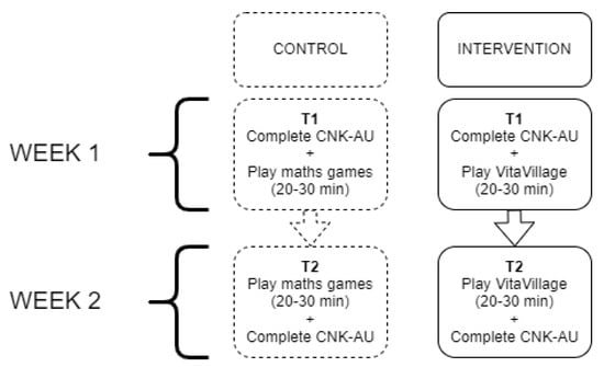 At baseline (T1), both groups completed a nutrition knowledge questionnaire on an Android tablet. Immediately after, the control group played mathematics games and the intervention group participants played VitaVillage for approximately 20 minutes. Exactly one week later (T2) the researchers returned to the schools, where the control participants played mathematics games and the intervention group played VitaVillage again for 20 minutes. Participants in both groups then completing the nutrition knowledge questionnaire for the second time. See