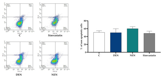 HepG2 cells were seeded in a 6-well plate (8 × 105 cells/well) and they were treated with YVVNPDNDEN (350 μM), YVVNPDNNEN (350 μM) or simvastatin (20 μM). After 24 h, cells were washed with phosphate-buffered saline (PBS), centrifuged and stained with FITC annexin V and red-fluorescent propidium iodide (Thermo Fisher). All the samples were analysed by flow cytometry (Novocyte 3000, ACEA Bioscience, San Diego, CA, USA), measuring the fluorescence emission at 530 nm and >575 nm.