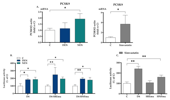 Impact of soy peptides on PCSK9 gene expression and transcriptional activity. Panel (A) shows the gene expression of PCSK9 in HepG2 cells incubated with YVVNPDNDEN (350 μM) and YVVNPDNNEN (350 μM) in MEM supplemented with 10% FBS for 24 h. Simvastatin (20 μM) was used as a positive control. At the end of the incubation, total RNA was extracted. Panels (B,C) show HepG2 cells transfected with pGL3-PCSK9-D4, pGL3-PCSK9-SREmut, and pGL3-PCSK9-HNF1mut. The day after the transfection, the medium was replaced by MEM containing 10% LPDS supplemented with YVVNPDNDEN (350 μM) and YVVNPDNNEN (350 μM) and the specific luciferase activity was determined. Panel (C) shows luciferase activity upon treatment with simvastatin. At least three independent experiments were conducted. * p < 0.05 versus control (ANOVA) and ** p < 0.01 versus control (ANOVA). C, control (medium alone). LPDS, lipoprotein deprived serum; HNF1, hepatocyte nuclear factor-1; PCSK9, proprotein convertase subtilisin/kexin type 9; SRE, sterol regulatory element. Simvastatin has been used as a positive control (C). DEN stands for YVVNPDNDEN and NEN stands for YVVNPDNNEN.