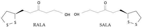 ALA has optical isomers due to the presence of chiral carbons, which are of two types: R (RALA) and S (SALA) (Figure 1). RALA is a naturally occurring form that is considered to have high biological activity [10]. In contrast, SALA has been reported to aggravate diabetes and is considered to be a potential cause of health problems [11]. However, free RALA is extremely unstable and weak in heat and acid, so it is used as a racemic mixture containing equal proportions of RALA and SALA (DLALA) in supplements and other products [12].