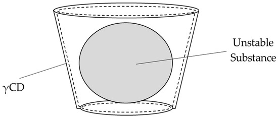 Cyclodextrin (CD) is a cyclic oligosaccharide that is classified into α (6), β (7), and γ (8) according to the number of glucose chains [13]. γCD complexes have an interesting feature of stabilization of unstable substances by incorporating them into the hydrophobic cavity of γCD (Figure 2). It is possible to stabilize the unstable substance and increase its function by encapsulation [14]. It has been reported that the stability of RALA in gastric acid was improved by formation of γCD complex with RALA (γCD/RALA) [15].