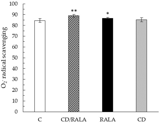 Figure 5. O2 radical scavenging activity (%) of the kidney. Values are expressed as the mean ± SD for six mice in each group. C, control group; CD/RALA, R-α-lipoic acid γ-cyclodextrin complex group; RALA, R-α-lipoic acid group; CD, γ-cyclodextrin group. ** p < 0.01 vs. C. * p < 0.05 vs. C.
