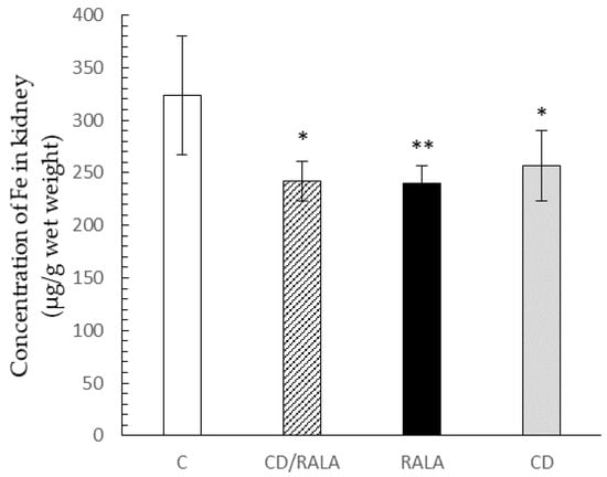 Figure 6. Concentration of Fe in the kidney. Values are expressed as the mean ± SD for six mice in each group. C, control group; CD/RALA, R-α-lipoic acid γ-cyclodextrin complex group; RALA, R-α-lipoic acid group; CD, γ-cyclodextrin group. ** p < 0.01 vs. C, * p < 0.05 vs. C.