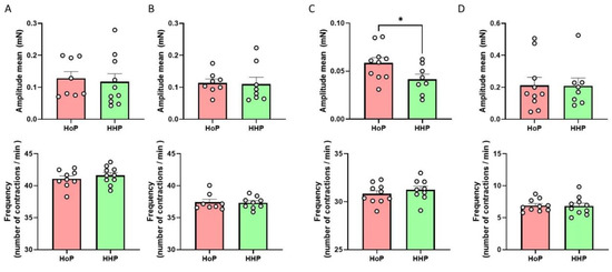 HHP-BM decreases duodenal contraction amplitude. Ex vivo measurement of duodenum (A), jejunum (B), ileum (C) and colon (D) mechanical contraction amplitude and frequency in response to HoP- or HHP-BM added in the medium (100 µL, n = 7–8). Results are expressed as a percentage of the basal contractions amplitude or frequency. * p < 0.05 compared to HoP-BM.