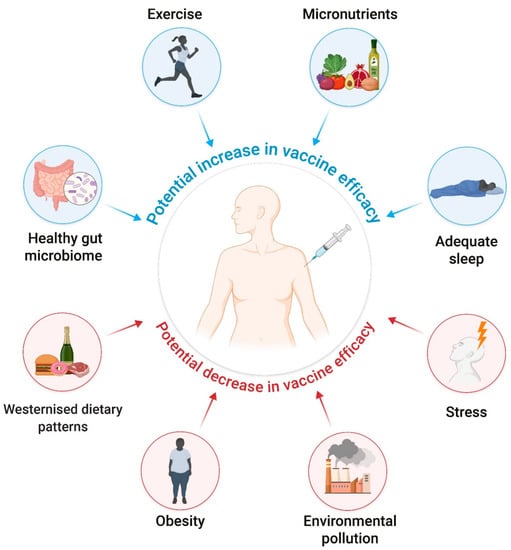 The gut microbiome could also affect the immune response to vaccination [,]. There is reasonable evidence that the gut microbiome improves both B cell and T cell responses to vaccination []. Of note, vaccine responses can vary widely between people in a given region []. A possible explanation is the high variability in the types of gut microbiota between populations []. For example, a study conducted in Ghanaian children concluded that the gut microbiome composition, which correlates significantly with rotavirus vaccine immunogenicity, might contribute to the diminished efficacy of rotavirus vaccines reported in developing countries []. Another study analysed the influence of gut microbiome on mucosal IgA antibody response to the polio vaccine in a population of Chinese infants []. The authors found that the composition of the gut microbiome was significantly different, reporting a higher and lower abundance of Firmicutes and Actinobacteria, respectively, in IgA-negative children than in their IgA-positive peers []. On the other hand, antibiotic administration in individuals with low levels of pre-existing immunity impairs responses to a seasonal influenza vaccine []. Conversely, a recent systematic review on the role of probiotics on vaccine responses suggested that probiotics represent a relatively cheap intervention to improve vaccine efficacy and duration of protection [].