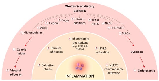 The westernised way of life has brought several changes to the human diet, particularly the widespread consumption of ultra-processed foods with a high content of fat, sugar, salt, and flavour additives that can cause an excess calorie intake []. These features contribute to obesity, which, as previously discussed, can lead to a proinflammatory status, impair immune function, and increase the risk of many chronic diseases (Figure 2).