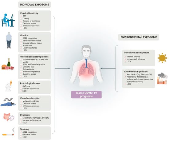 This review has some methodological limitations that should be considered. First, its narrative nature is likely to induce some bias, as it lacks strict criteria for the inclusion/exclusion of studies. In addition, the overwhelming number of new studies published virtually every day on the COVID-19 pandemic implies that previous conclusions on a given area are frequently challenged and must be revisited, with new hypotheses frequently arising. In this regard, we finished writing the first draft of this review on 17 July 2021, and therefore, at the time this review is published, evidence might have been updated on certain topics. On the other hand, although exposome improvements seem to be a potentially effective strategy to deal with COVID-19, a vast amount of research still needs to be implemented not only to shed light on the effects of combining a healthy lifestyle with environmental exposure but also to disentangle potential pathophysiological underpinnings. After reviewing the current literature, we have provided practical, testable hypotheses for future research in the field.