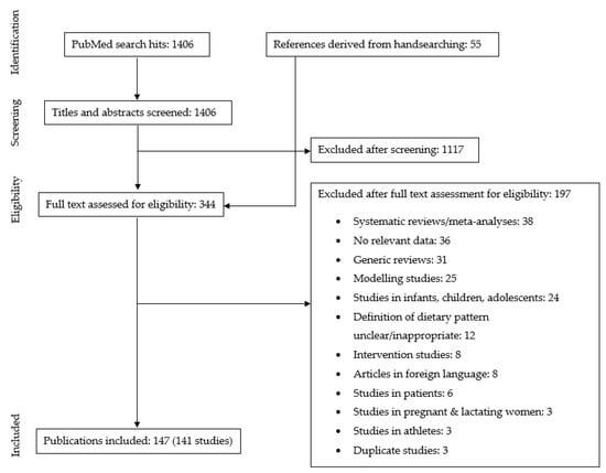 - Type of studies: Observational studies and intervention studies (baseline data only), that compared nutrient intake and/or status of subjects following a predominantly plant-based diet with subjects following a conventional diet with meat were included. In addition, studies that reported only on subjects following a predominantly plant-based diet were also included. Generic reviews, case studies, and articles not published in English language were excluded;