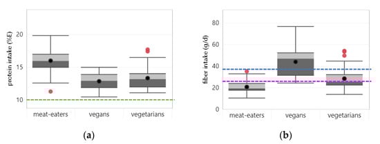 - Sobiecki, J.G.; Appleby, P.N.; Bradbury, K.E.; Key, T.J. High compliance with dietary recommendations in a cohort of meat eaters, fish eaters, vegetarians, and vegans: Results from the European Prospective Investigation into Cancer and Nutrition-Oxford study. Nutr. Res. 2016, 36, 464–477. [Google Scholar] [CrossRef] [PubMed]