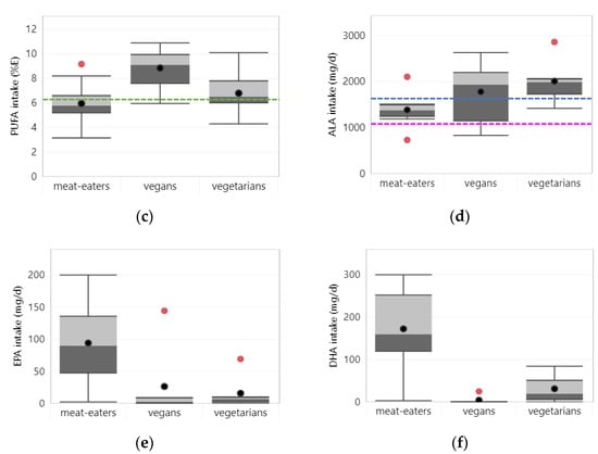 | Meat-eaters | fiber, PUFA, ALA (in men), | protein, |