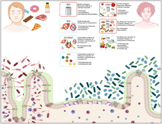 Effects of diet and nutritional therapies on intestinal microbiota and mucosal immune response. Dietary influences affect the intestinal microbiota and impact mucosal immune responses through numerous direct and indirect mechanisms. A typical western diet (LEFT), consisting of high amounts of processed foods, red meat, high-sugar foods, and prepackaged foods, can induce a relative dysbiosis in the intestinal lumen, increase intestinal permeability at epithelial junctions, and promote direct bacterial translocation across the epithelial membrane. Nutritional therapies in patients with IBD (RIGHT) support a healthier composition of bacterial taxa, which decreases inflammation at the intes-tinal epithelium, reduces intestinal permeability, and decreases mucosal inflammation. Multiple nutritional therapies are proposed for the treatment of CD and UC, including EEN, CDED, and PEN (diets with proof of clinical efficacy in IBD, outlined in red), and SCD, CD-TREAT, MD, and LFD (diets with no proof of clinical efficacy in IBD, outlined in blue). Diets depict major food groups that are permitted (foods/carbohydrate structures presented within each box) and re-stricted (foods crossed out within each box). Clinical efficacy and significant changes to bacterial taxa (phylum level) are described for each diet. Crohn’s disease (CD); Crohn’s disease exclusion diet (CDED); Crohn’s disease treatment-with-eating diet (CD-TREAT); exclusive enteral nutrition (EEN); fecal calprotectin (FC); inflammatory bowel disease (IBD); low fermentable oligo-, di-, monosaccharides and polyol (FODMAP) diet (LFD); Mediterranean diet (MD); partial enteral nutrition (PEN); specific carbohydrate diet (SCD); ulcerative colitis (UC). (Created in BioRender.com, accessed on 1 December 2021) [36].
