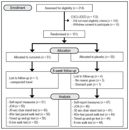 Turmeric, the dried or fresh rhizome of the plant Curcuma longa L., is a common cooking spice that has also been extensively used in traditional medicine. Turmeric contains several phytochemicals such as turmerones and various polysaccharides; however, curcuminoids are believed to be responsible for most of turmeric’s therapeutic activity []. Curcuminoids are a mixture of curcumin, demethoxycurcumin, bisdemethoxycurcumin, and cyclocurcumin, with curcumin receiving the greatest attention as a natural treatment option for a range of inflammatory and pain-related conditions [,]. As a treatment for OA, there have been several trials that demonstrate it may reduce pain and increase function in OA sufferers. In two recent meta-analyses, it was confirmed that curcumin and turmeric extracts may be effective for the treatment of knee OA, with minimal adverse effects [,]. However, most of these studies have not included functional assessments and many have been evaluated as having a high risk of bias leading to some uncertainty about the true effect of curcumin for the treatment of knee OA []. The aims of this study were to examine the pain-relieving and functional effects of a curcumin extract (Curcugen®) using validated self-report and objective performance-based functional assessments. As most studies have been conducted in Asian countries, we were also interested in examining the efficacy and tolerability of curcumin in an Australian population that typically includes diverse ethnic groups.