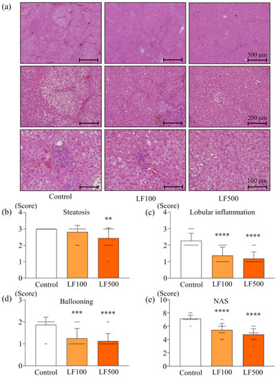 Preventive effect of lactoferrin on nonalcoholic steatohepatitis in rats. Connexin 32 dominant negative transgenic (Cx32ΔTg) rats were fed a high-fat diet (HFD), given an intraperitoneal injection of dimethylnitrosamine (DMN), and treated with lactoferrin (LF) for 17 weeks. (a) Representative histological findings of hematoxylin and eosin (H&E) stains in liver sections taken from Control, LF 100 mg/kg/day (LF100) or LF 500 mg/kg/day (LF500) rat groups. (b–e) Histopathological analysis of non-alcoholic steatohepatitis (NASH) was evaluated by severity scores for (b) steatosis, (c) lobular inflammation, (d) hepatocellular ballooning, and (e) a non-alcoholic fatty liver disease activity score (NAS). Data is shown as the mean ± SD, n = 15–16 per group, ** p < 0.01, *** p < 0.001, **** p < 0.0001 compared to the Control group.