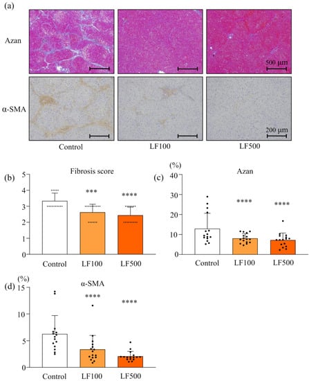 Histological observation by H&E staining also indicated that LF did not induce any changes in kidneys. In the liver, treatments of a HFD and DMN induced diffuse deposits of fat droplets with hepatocellular ballooning and neutrophil infiltration in the lobule (Figure 1a). Lactoferrin treatment significantly reduced fat deposition, lobular inflammation, and ballooning injury of hepatocytes in a dose-dependent manner (Figure 1a–d and Table S1), resulting in decreased NAS (Figure 1e and Table S1). Bridging fibrosis and activated hepatic stellate cells (HSC) were visualized by Azan staining and α-SMA immunohistochemical staining, respectively, in a Cx32ΔTg–HFD–DMN rat NASH model (Figure 2a). The histological fibrosis score, percentages of the Azan-positive area (collagen), and percentages of the α-SMA-positive area (activated HSCs) were significantly reduced by LF in the NASH model (Figure 2a–d and Table S1).