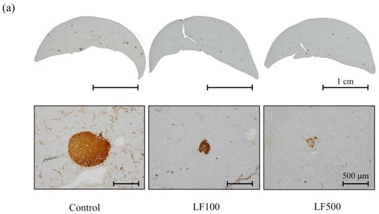 To date, the anti-tumor effect of LF on HCC was described in previous studies using a DEN-induced HCC model in rats or mice [48,49], but effects of LF on NASH-related hepatocarcinogenesis have not been established. The glutathione S-transferase placental form is a well-known marker for preneoplastic lesions in rat liver. Therefore, carcinogenic potentials in the liver can be measured by GST-P immunohistochemistry in the early phase of hepatocarcinogenesis [25]. The number and area of GST-P-positive foci in the liver tended to decrease in LF-treated groups, although a significant difference was not found (Figure 4). We previously induced GST-P-positive foci in a NASH model using DEN [10] or DMN [15]. Both the number and area of GST-P-positive foci induced by DMN were decreased compared to those induced by DEN, which might influence the lack of significant difference by LF in this study. The chemopreventive effect of LF on NASH-related hepatocarcinogenesis should be investigated in a future study.
