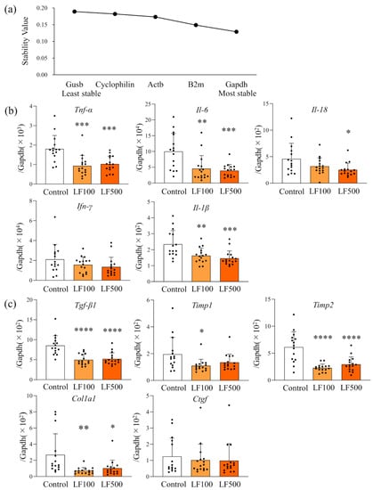 Previous studies, including ours, strongly indicated that expression of inflammatory cytokines associated with inflammation (Tnf-α, Il-6, Il-18, Ifn-γ, and Il-1β) and fibrosis (Tgf-β1, Timp1, Timp2, Col1a1, and Ctgf) correlated with histological NASH activity in human and rodent models [15,26,27,28]. Thus, we further quantitated their mRNA expression level using qRT–PCR. NormFinder analysis revealed that the stability value of Gapdh was the smallest among examined candidate housekeeping genes (Figure 4a). Therefore, we concluded Gapdh as the most stable gene and used it as a reference. As shown in Figure 4b, the inflammatory cytokines, Il-6, Tnf-α, Il-18, and Il-1β, were significantly down-regulated by LF compared with the control, and a dose-dependency was observed with Il-6, Il-18, and Il-1β. While not significant, Ifn-γ mRNA expression also tended to be decreased by LF (Figure 4b and Table S2). The mRNA expression of Tgf-β1, Col1a1, Timp1, Timp2, and Ctgf as fibrosis-related cytokines was also measured; Timp2, Col1a1, and Tgf-β1 were significantly down-regulated by LF (Figure 4c and Table S2). These results suggests that down-regulation of inflammatory cytokines by LF was involved in the attenuation of steatohepatitis and hepatic fibrosis in a Cx32ΔTg–HFD–DMN rat NASH model.