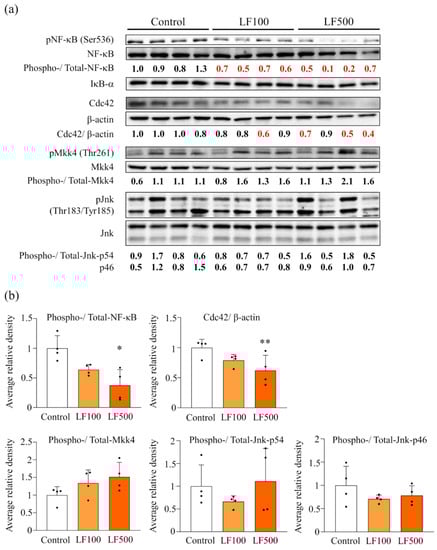 Previous studies showed that NF-κB and JNK/SAPK signaling were switched on in a rat NASH model mediated by MCDD or HFD and DMN combined [10,15]. Therefore, we investigated how such signal transduction was altered by the administration of LF. Western blotting showed that elevated pNF-κB protein expression in NASH was significantly decreased by the administration of LF in a dose-dependent manner. In contrast, phosphorylated Mkk4 and Jnk, which belong to JNK/SAPK signaling, were not affected by LF, even though their upstream protein, Cdc42, was significantly reduced in LF–treated groups (Figure 5). Such results indicate that the inactivation of NF-κB, but not JNK/SAPK signaling, is involved in the preventive effect of LF against NASH development in rats.