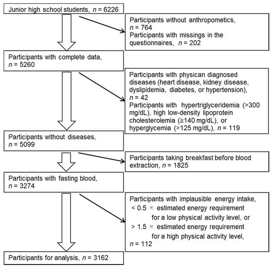 This study was part of the Shunan Child Cohort Study described in detail elsewhere [23,24,25]. The participants were 8th-grade junior high school students from 17 junior high schools in Shunan City, Japan. From 6805 students attending any of the schools between 2006 and 2010, 6226 students participated in this study with their guardians’ consent. We excluded those with missing variables; with physician-diagnosed diseases; who had taken breakfast before blood extraction; with high plasma glucose, triglyceride, or low-density lipoprotein cholesterol levels due to possible postprandial values, or familial hypercholesterolemia; and with implausible energy intake (Figure 1). Overall, we analyzed the data of 3162 participants.