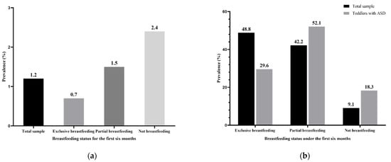 Breastfeeding status in the first six months among 6049 toddlers: (a) prevalence of ASD in the total sample; (b) prevalence of different breastfeeding statuses in total sample and toddlers with ASD.