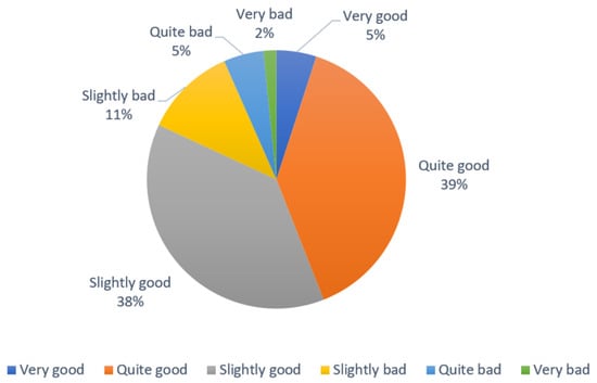 Regarding self-reported health in general, the distribution of scores was as follows: very bad (1.8%), bad (37.9%), quite bad (12.3%), quite good (38.3%), good (9.5%), and very good (0.4%), with a mean score of 3.2 points (SD = 1.1). The VAS scale measuring self-reported health today had a mean score of 50.3 for a range of 0–90 (SD = 17.6).