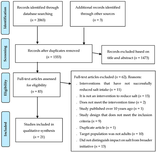 The search identified 2065 records and three additional records were added by scanning the reference lists of articles included in this article and in systematic reviews that emerged from the data search. After discarding duplicates, 1553 abstracts were selected to review titles and abstracts, leaving 83 complete articles to be evaluated for eligibility. Of these, 62 full articles were excluded; the reasons for the exclusion of these studies were: 14 studies in which the interventions did not successfully reduce salt intake, 15 were not an intervention to reduce salt, two did not meet the intervention time, one study was published over 10 years ago, nine studies with study design did not meet the inclusion criteria, one was a duplicate article, there were 10 studies in which the target population was not adult, and 10 studies did not distinguish the impact on salt consumption of a broader initiative. After screening, 21 articles were included for qualitative synthesis (Figure 1).