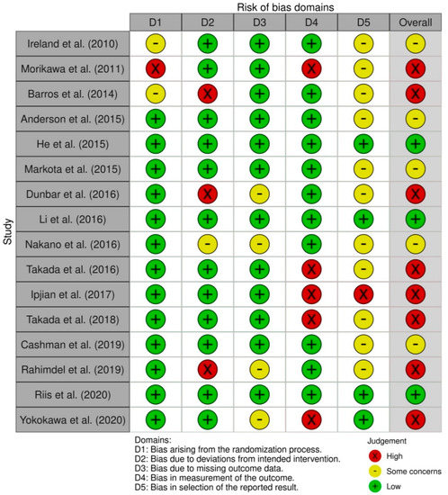 - Sterne, J.A.C.; Savović, J.; Page, M.J.; Elbers, R.G.; Blencowe, N.S.; Boutron, I.; Cates, C.J.; Cheng, H.-Y.; Corbett, M.S.; Eldridge, S.M.; et al. RoB 2: A revised tool for assessing risk of bias in randomised trials. BMJ 2019, 366, l4898. [Google Scholar] [CrossRef] [Green Version]