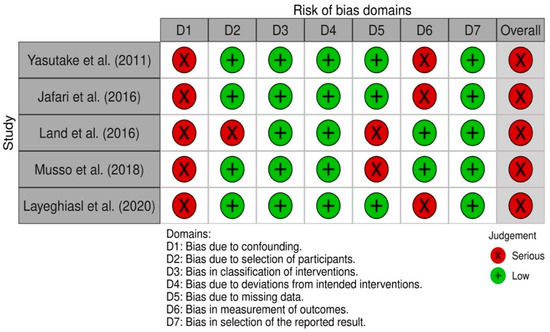 The ROBINS-I tool includes seven domains divided by pre-intervention and at-intervention (confounding, selection of participants into the study, classification of intervention) and post-intervention (derivations from intended intervention, missing data, measurement of outcomes, selection of the reported result). The results of the judgment for each domain and for the final overall bias were categorized as low, moderate, serious, or critical risk of bias, or no information.