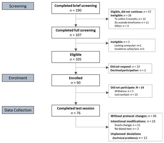 A total of 90 participants were enrolled; 76 completed their test session. Figure 1 displays the participant flow from recruitment to completion. Final sample demographics (n = 76) are listed in Table 1.