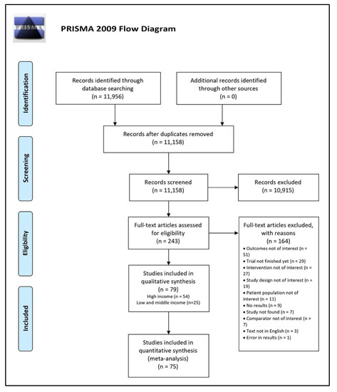Our literature search identified 11,158 titles after exclusion of duplicates. Figure 1 shows the results of the literature search. The 11,158 studies were reduced to 243 full-text studies after applying the exclusion criteria stated in our methods section. After screening the full text of 243 studies, we ultimately included 79 studies in our systematic review, of which 54 studies were from high-income countries, and 25 studies from low- and middle-income countries [20,21,22,23,24,25,26,27,28,29,30,31,32,33,34,35,36,37,38,39,40,41,42,43,44,45,46,47,48,49,50,51,52,53,54,55,56,57,58,59,60,61,62,63,64,65,66,67,68,69,70,71,72,73,74,75,76,77,78,79,80,81,82,83,84,85,86,87,88,89,90,91,92,93,94,95,96,97,98]. We excluded 164 studies, and reasons for exclusion can be found in Table S1.