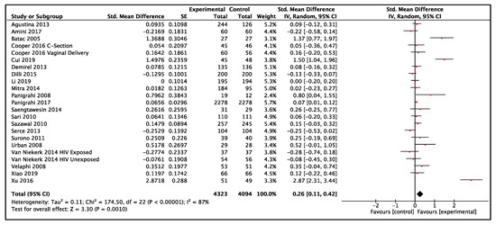 We pooled the dichotomous outcomes to obtain a summary estimate in the form of mean relative risk (RR) and reported with its 95% confidence interval (CI). We used the standardized mean difference effect size for continuous outcomes due to studies reporting data in different units (e.g., a few studies reported weight in kg and the others in Z scores) and reported the standardized mean effect with its 95% CI. We used Review Manager 5.4 and Stata to conduct the meta-analysis [15,16]. We used the random-effects models to pool data as the effect of probiotics could be different in different study populations. We used funnel plots and Egger’s test to assess for publication bias.