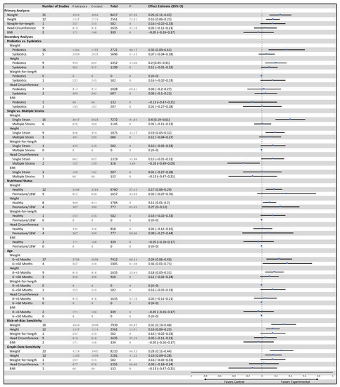 The following are available online at https://www.mdpi.com/article/10.3390/nu14010083/s1, Text S1: Search strategies for databases through November 6, 2020; Text S2: Extended data-input details; Text S3: Results: Study Locations; Table S1: Excluded studies and reasons for exclusion; Table S2: Participant characteristics in the included studies from low- and middle-income countries; Table S3: Participant characteristics in the included studies from high-income countries; Table S4: Treatment and comparison characteristics in the included studies from low- and middle-income countries; Table S5: Treatment and comparison characteristics in the included studies from high-income countries; Table S6: Pooled analysis based on probiotic strains: Low- and middle-income countries; Table S7: Pooled analysis based on probiotic strains: High-income countries; Figure S1: Funnel Plot: Effect of probiotics on growth: Low- and middle-income countries: Weight; Figure S2: Funnel Plot: Effect of probiotics on growth: High-income countries: Weight; Figure S3: Funnel Plot: Effect of probiotics on growth: Low- and middle-income countries: Head Circumference; Figure S4: Funnel Plot: Effect of probiotics on growth: High-income countries: Height; Figure S5: Funnel Plot: Effect of probiotics on growth: High-income countries: Head circumference; Figure S6: Risk of bias in the included studies from low- and middle-income countries for effect of probiotics on the outcome of weight-for-age; Figure S7: Risk of bias in the included studies from low- and middle-income countries for the outcome of height-for-age; Figure S8: Risk of bias in the included studies from low- and middle-income countries for the outcome of head circumference; Figure S9: Risk of bias in the included studies from low- and middle-income countries for the outcome of sepsis; Figure S10: Forest Plot: Effect of use of probiotics on head circumference in children 0–59 months of age from low- and middle-income countries; Figure S11: Forest Plot: Effect of use of probiotics on BMI in children 0–59 months of age from low- and middle-income countries; Figure S12: Forest Plot: Effect of use of probiotics on weight for height in children 0–59 months of age from low- and middle-income countries; Figure S13: Forest Plot: Effect of use of probiotics on adverse events: Sepsis, in children 0–59 months of age from low- and middle-income countries; Figure S14: Forest Plot: Effect of use of probiotics on adverse events: Vomiting, in children 0–59 months of age from low- and middle-income countries; Figure S15: Forest Plot: Effect of use of probiotics on adverse events: Diarrhea, in children 0–59 months of age from low- and middle-income countries; Figure S16: Forest Plot Effect of use of probiotics on weight-for-age in children 0–59 months of age from high-income countries; Figure S17: Forest Plot: Effect of use of probiotics on height-for-age in children 0–59 months of age from high-income countries; Figure S18: Forest Plot: Effect of use of probiotics on weight-for-length in children 0–59 months of age from high-income countries; Figure S19: Forest Plot: Effect of use of probiotics on head circumference for age in children 0–59 months of age from high-income countries; Figure S20: Forest Plot: Effect of use of probiotics on BMI in children 0–59 months of age from high-income countries; Figure S21: Forest Plot: Effect of use of probiotics on adverse events: Sepsis, in children 0–59 months of age from high-income countries; Figure S22: Forest Plot: Effect of use of probiotics on adverse events: Vomiting, in children 0–59 months of age from high-income countries; Figure S23: Forest Plot: Effect of use of probiotics on adverse events: Diarrhea, in children 0–59 months of age from high-income countries; Figure S24: Forest Plot: Effect of use of probiotics on adverse events: Abdominal pain, in children 0–59 months of age from high-income countries; Figure S25: Forest Plot: Effect of use of probiotics on adverse events: Flatulence, in children 0–59 months of age from high-income countries; Figure S26: Risk of bias in the included studies from high-income countries for effect of probiotics on the outcome of weight-for-age; Figure S27: Risk of bias in the included studies from high-income countries for effect of probiotics on the outcome of height-for-age; Figure S28: Risk of bias in the included studies from high-income countries for effect of probiotics on the outcome of weight-for-length; Figure S29: Risk of bias in the included studies from high-income countries for effect of probiotics on the outcome of head circumference; Figure S30: Risk of bias in the included studies from high-income countries for effect of probiotics on the outcome of BMI; Figure S31: Risk of bias in the included studies from high-income countries for effect of probiotics on the outcome of sepsis; Figure S32: Subgroup and Sensitivity analyses in high-income countries.